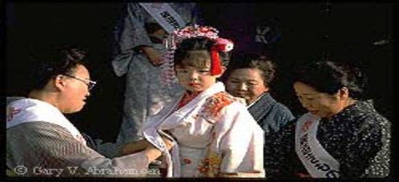 Parents can not expect their child to wear something as difficult to wear as a kimono without something coming undone. At this temple, a local kimono club set up a dressing area where parents could take their children to have their outfits put back together. back to the top