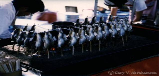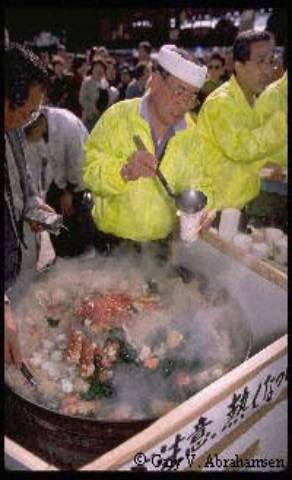 The Tsukiji Fish Market in Tokyo opened it's gates to the public for it's first ever festival in 1997. The festival was crowded, interesting and a good way to promote seafood. Although the festival began after 10:00 AM and the market itself was shut down, it was still a good chance to walk around the market to see the stalls as well as mock fish auctions, displays of seafood and tools of the trade. While I was interested in the workings of the fish market, most others seemed to be interested in trying some of the many samples of cook seafood on sale- crab (the picture on the right), shrimp, squid, tuna and whale. Yes, whale. back to the top